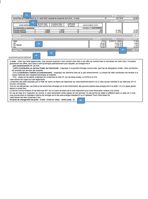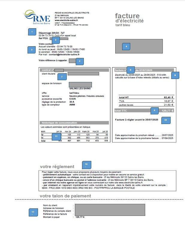 En cliquant sur les encadrés bleus, vous accéderez aux explications détaillés de la facture d'électricité de la RME de Salins.